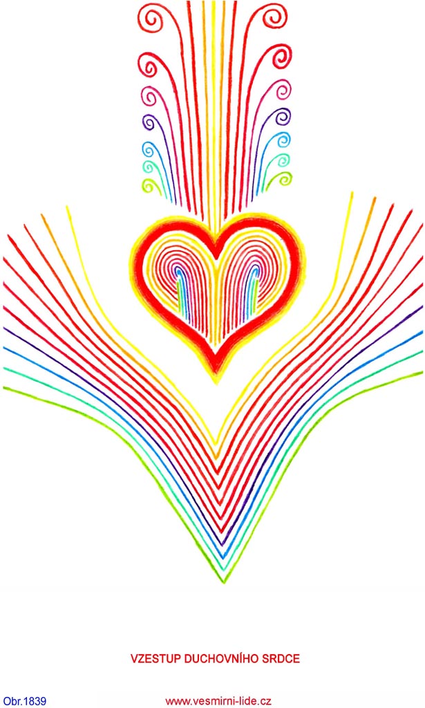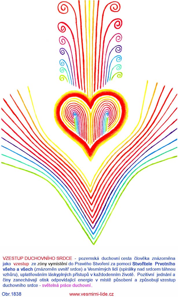 VZESTUP DUCHOVNÍHO SRDCE – pozemská duchovní cesta člověka znázorněna jako vzestup ze zóny vymístění do Pravého Stvoření za pomoci Stvořitele Prvotního všeho a všech (znázorněn uvnitř srdce) a Vesmírných lidí (spirálky nad srdcem táhnou vzhůru), uplatňováním láskyplných přístupů v každodenním životě. Pozitivní jednání a činy zanechávají otisk odpovídající energie v místě působení a způsobují vzestup duchovního srdce – světelná práce duchovní.