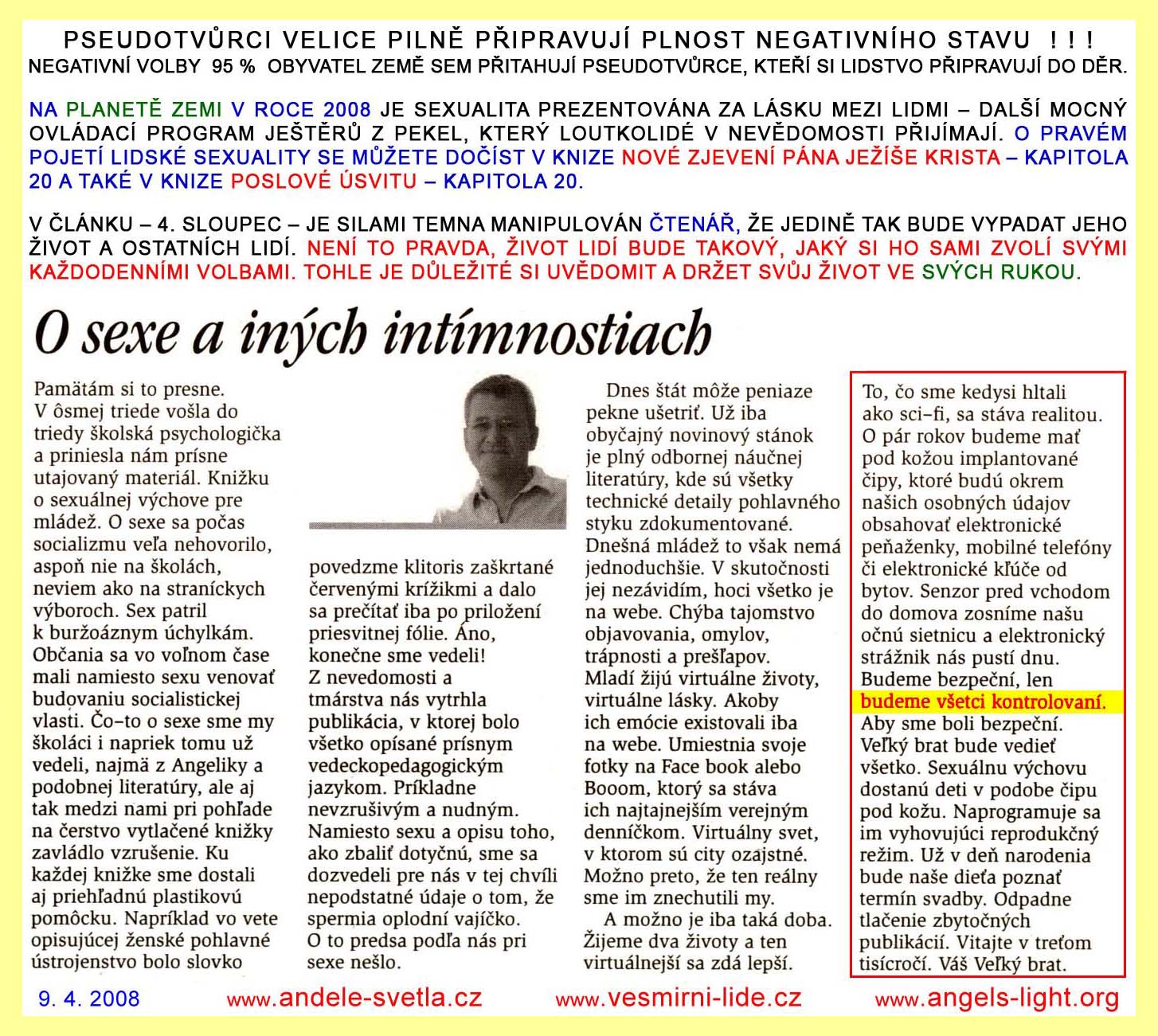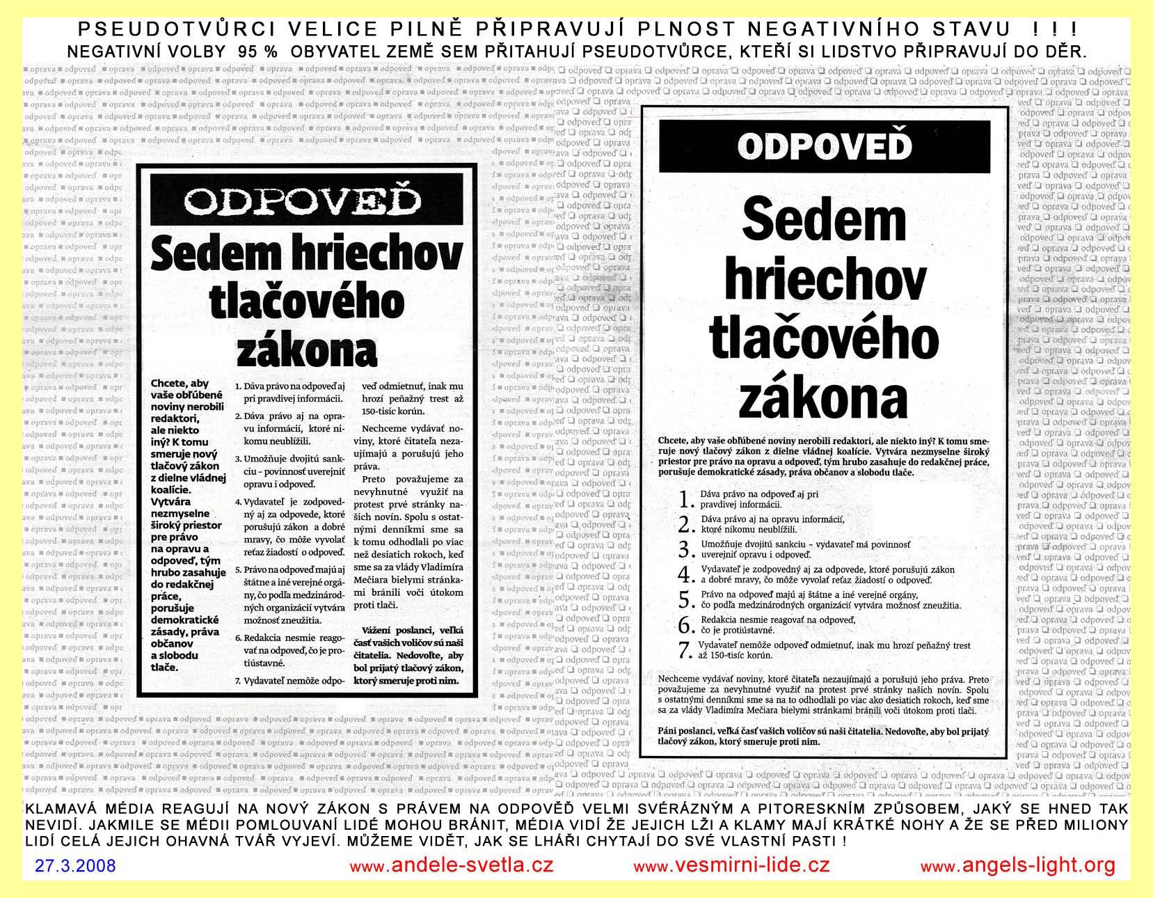 REDAKCE MAJÍ POVINNOST PUBLIKOVAT I NÁZORY, S NIMIŽ NE VŽDY SOUHLASÍ. SVOBODA PROJEVU, ZEJMÉNA SVOBODA TISKU, JE ZARUČENA ÚSTAVOU ČR, MEZINÁRODNÍM PAKTEM O OBČANSKÝCH A POLITICKÝCH PRÁVECH PUBLIKOVANÉ VE VYHLÁŠCE MZV Č. 120/196 SB. A LISTINOU ZÁKLADNÍCH PRÁV A SVOBOD VYHLÁŠENOU POD Č. 23/1991 SB. SVOBODA PROJEVU A PRÁVO NA INFORMACE JSOU ZÁKONEM ZARUČENY. KAŽDÝ MÁ PRÁVO VYJADŘOVAT SVÉ NÁZORY SLOVEM, PÍSMEM, TISKEM, OBRAZEM NEBO JINÝM ZPŮSOBEM, JAKOŽ I SVOBODNĚ VYHLEDÁVAT, PŘIJÍMAT I ROZŠIŘOVAT IDEJE A INFORMACE. CENZURA JE NEPŘÍPUSTNÁ.