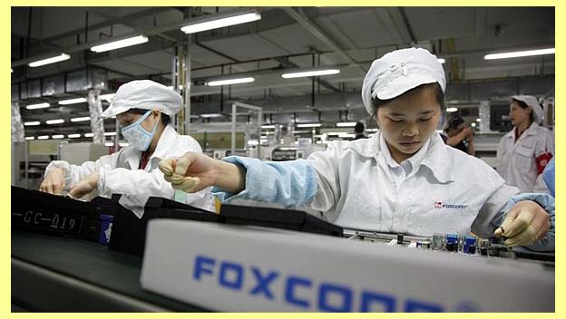 V nechvalně proslulé továrně v Čchengdu visí v hale transparent s heslem: "Pracuj těžce dnes, nebo budeš zítra těžce hledat práci.“