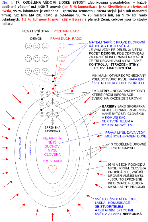 Obr. 1: TŘI ODDĚLENÁ VĚDOMÍ LIDSKÉ BYTOSTI zfabrikovaná pseudotvůrci – každé oddělené vědomí má ještě 3 úrovně (jen 5 % komunikace je se Stvořitelem a s bytostmi Světla, 95 % informace je ovládána – zprzněna Temnotou, řízena stejně jako řídí manažeři firmu). Viz film MATRIX. Takto je ovládáno 90 % (6 miliard) lidí, asi 9 % lidí málo ovládaných, 1,2 % lidí neovládaných (žijí v lásce) na planetě Zemi, celkové jsou to stovky miliard: