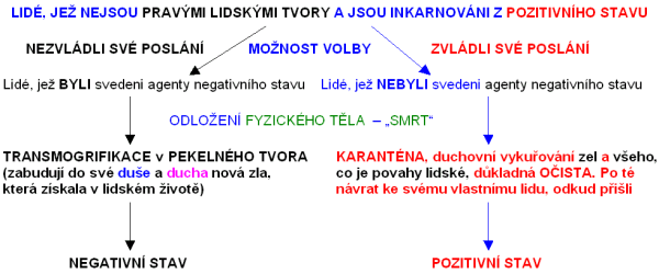 Jak bylo již naznačeno, bytosti tyto, jež obrátily tento vývoj svůj směrem k Temnotě je vedoucí a mají už hmotné, jemnohmotné či polohmotné tělo vždy takto nejprve poníží vibrace tohoto těla svého a přejdou v dimenzi či úroveň příslušnou nižší, kde takto dále pokračují ve vývoji tomto svém, až dospějí k destrukci – zániku těla svého či celé planety, kde takto působí. Pak, jako duše – těla astrální, však většinou neprohlédnou a i nadále pokračují ve vývoji tomto svém opačném. Toto však již neprobíhá na úrovni světů duchovních – astrálních Stvořitele nás všech a všeho prvotního, nýbrž na úrovni světů jim v protikladu stojícím. To jsou světy či paralelní vesmíry těles holoproudých fáze 3. a 4. těchto bytostí temných kdy takto zcela již opustí duše tyto cestu svou pravou zpět ke světlům Stvořitele nás všech a všeho prvotního vedoucí a bloudí takto celé věky světy těmito temnými.