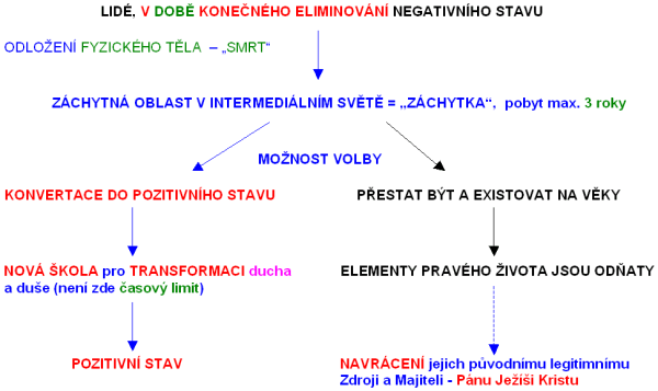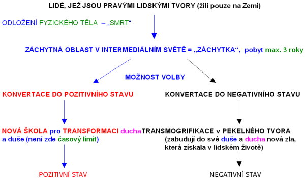 Poté nastává velice důležitý mezník pro duši tuto a jest jí dovoleno Stvořitelem prvotním nás všech a všeho po absolvování tohoto jejího dosavadního vývoje její první vtělení v tělo lidské hrubohmotné, kdy příprava na vtělení toto již naposledy probíhala na úrovni paralelních vesmírů dimenze 1. Od této chvíle pak již jest duše – tělo astrální takto vedena a má již takto ve větší míře rozvinutou svobodnou vůli svou v těle svém lidském, kdy jest úkolem jejím tímto se rozhodovati z vlastní vůle svobodné pro dobro a Světlo na cestě této své duchovní. Pak také příprava, tedy tříbení duší – těl astrálních, probíhá již od této chvíle na úrovni duchovních světů Stvořitele nás všech a všeho prvotního vyšších, počínaje dimenzí 4. a ostatními vyššími. Duši – tělu astrálnímu jest dovoleno pak Stvořitelem prvotním nás všech a všeho cestovat těmito dimenzemi i o několik úrovní vyššími, než jest 4. v tom případě, žily-li duše tyto příkladný život v těle svém lidském hmotném. Toto pak již má další úzkou souvislost se schématem vám předaném ve sdělení předešlém. O tomto však budeme si povídat zase až příště.