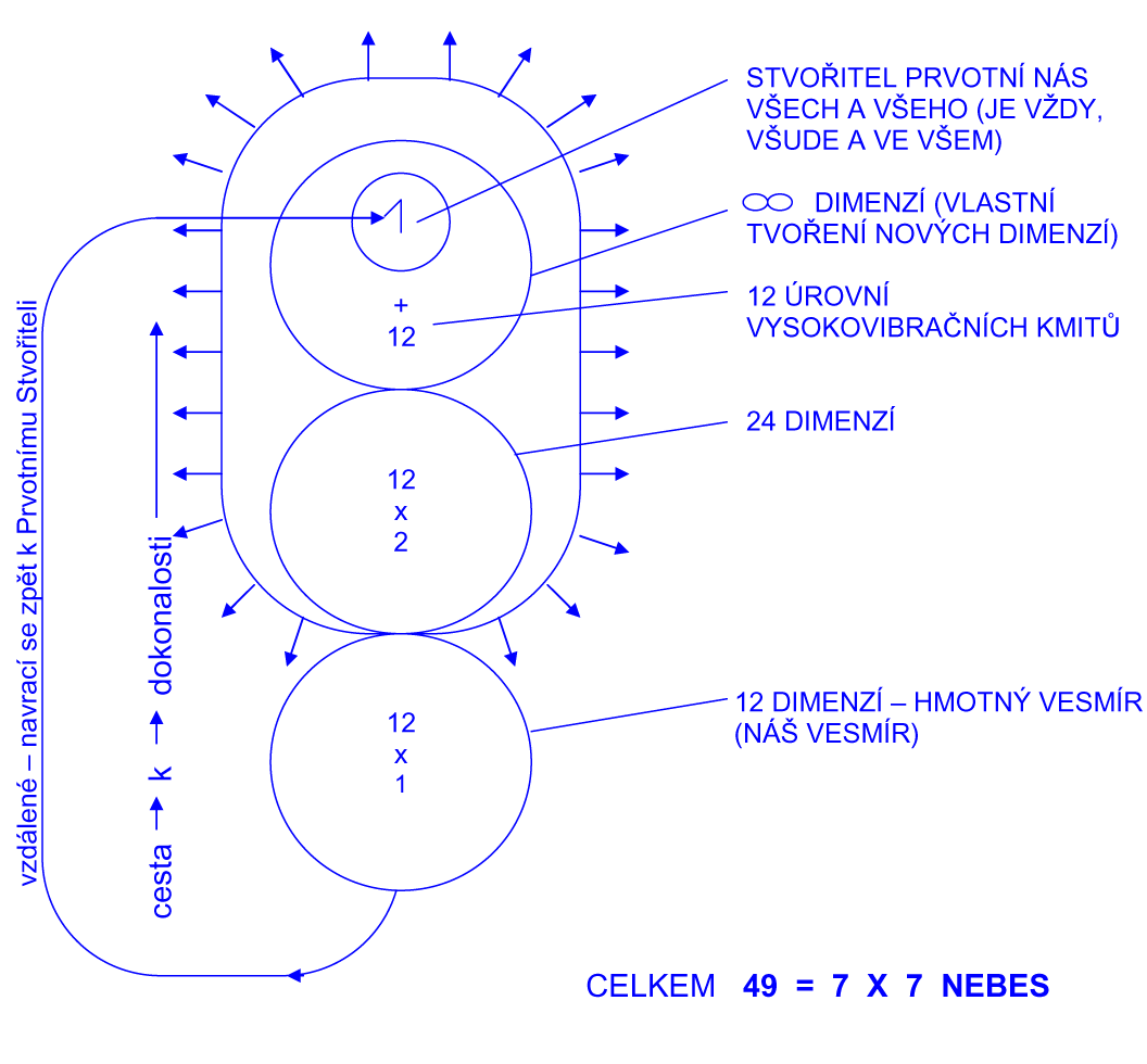 Jak sis ty i další značné množství čtenářů mohl přečíst v knize Hovory s Bohem III., jest duše – tělo astrální přítomna všude, nikde nezačíná a nikde nekončí, což jest onou největší Boží ditochomií, kterou vy, lidé pozemští, jen velice obtížně chápete (Hovory s Bohem III., str. 160-167). Skutečně jest toto pro vás značně obtížné a pro malé osvětlení tohoto vzniká zde psaní o vesmírech paraleních či dimenzích Stvořitele prvotního nás všech a všeho, kdy bude lidstvu předáno poselství o struktuře a hierarchii bytí. Jest zde návaznost na sdělení 894., 14.2. – Kristus odhaluje stát démonů, jeho přisluhovači a jeho oběti, kde je na str. 17. Psáno: „Věčné bytí sestává ze 7x7 nebes“ a již další výklad k tomuto dále pak uveden není. Ano, věčné bytí jest vše, co jest, co bylo a co i nadále bude a lze toto vyjádřit takto následujícím schématem, jež nazveme si zde TVORBA: